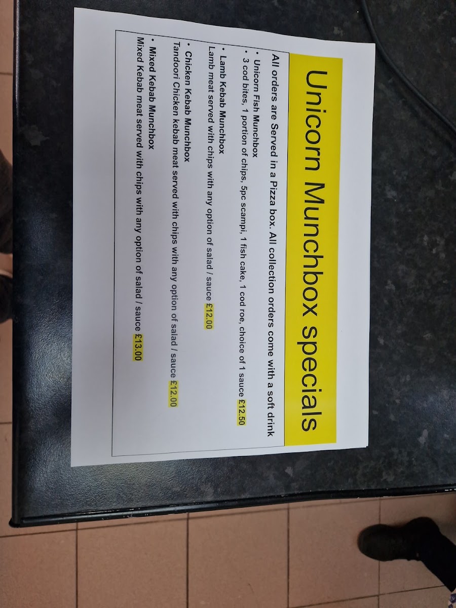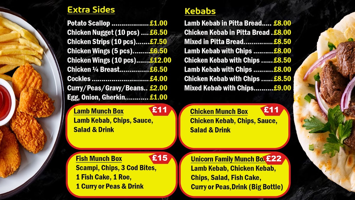 Unicorn Chippy offers several “Munchbox Specials” which combine popular items into convenient meal boxes, such as Unicorn Fish, lamb, chicken, or mixed kebab options. Other individual items on the menu include saveloy, pukka pies, potato chips, and lobster rolls, catering to a range of tastes.