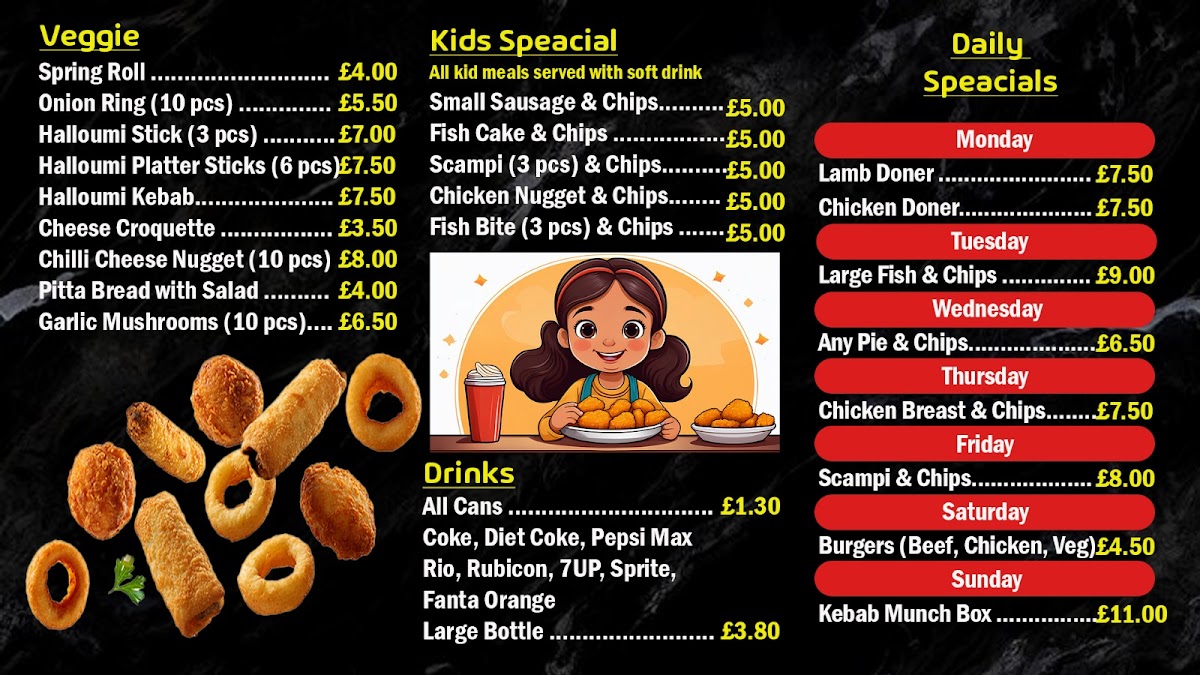 This menu is suitable for quick ordering or casual takeaway meals, offering a range of portion sizes and combinations designed to accommodate different appetites. The selection caters primarily to lunch and dinner occasions, focusing on fast, familiar food options commonly found in a takeaway setting.