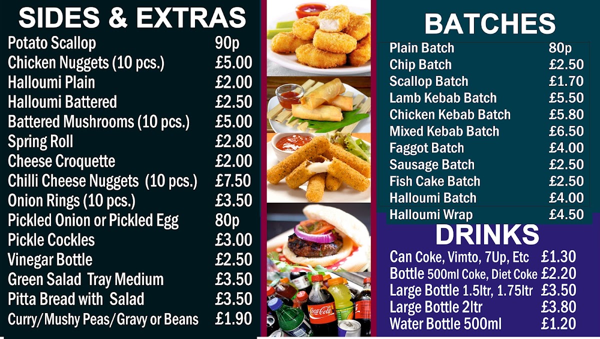To accompany the main dishes, several sides and extras are available, including chicken nuggets, halloumi (plain or battered), spring rolls, cheese croquettes, chilli cheese nuggets, onion rings, and pickled items like pickled onions or eggs. There are also salad options such as cucumber and green salad trays, along with pitta bread served with salad. Traditional British sides like mushy peas or curry are also part of the menu.