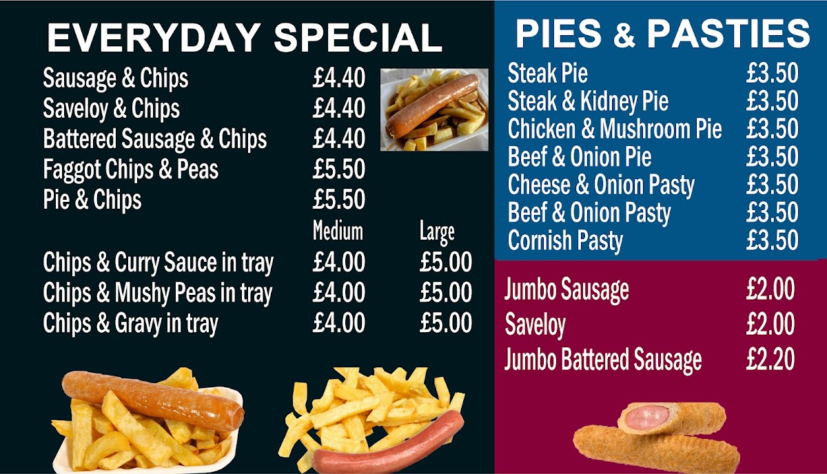 The menu at Unicorn Chippy offers a variety of fast food options centered around traditional fish and chips, alongside a diverse selection of other takeaway items. Visitors can find classic cod and haddock dishes, complemented by sides such as French fries, potato scallops, and battered mushrooms. For those seeking alternative main options, the menu includes pulled pork, lamb and chicken kebabs, gyro, BBQ chicken and pepperoni pizzas, and various burgers.